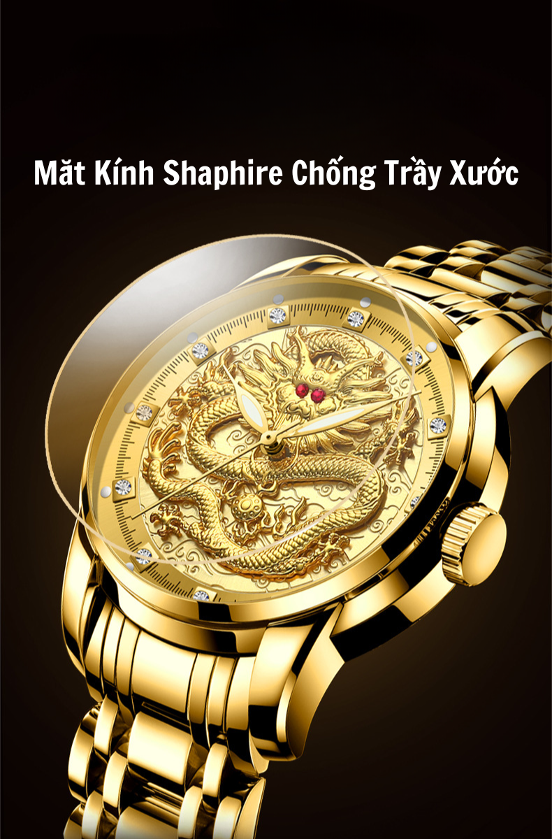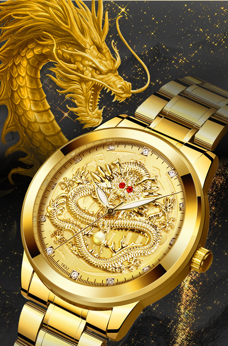 Đồng hồ nam hình rồng vàng, khắc nổi siêu tỉ mỉ, tinh tế. Dây được thiết kế bằng thép không gỉ, chống thấm nước. Thích hợp để làm quà tặng cho quý ông.