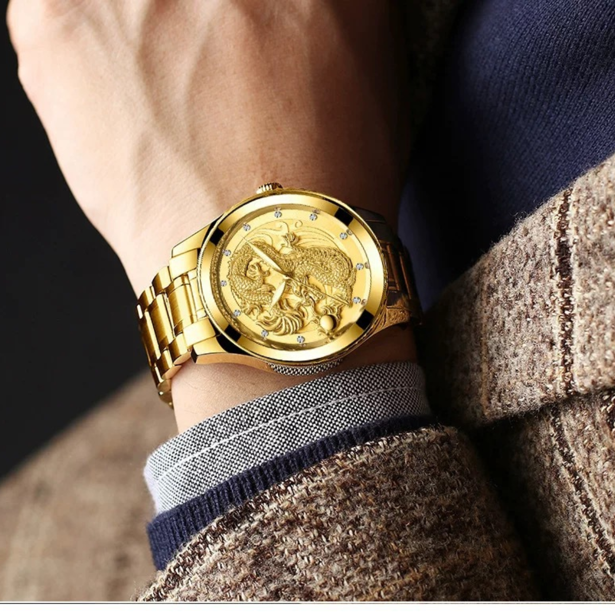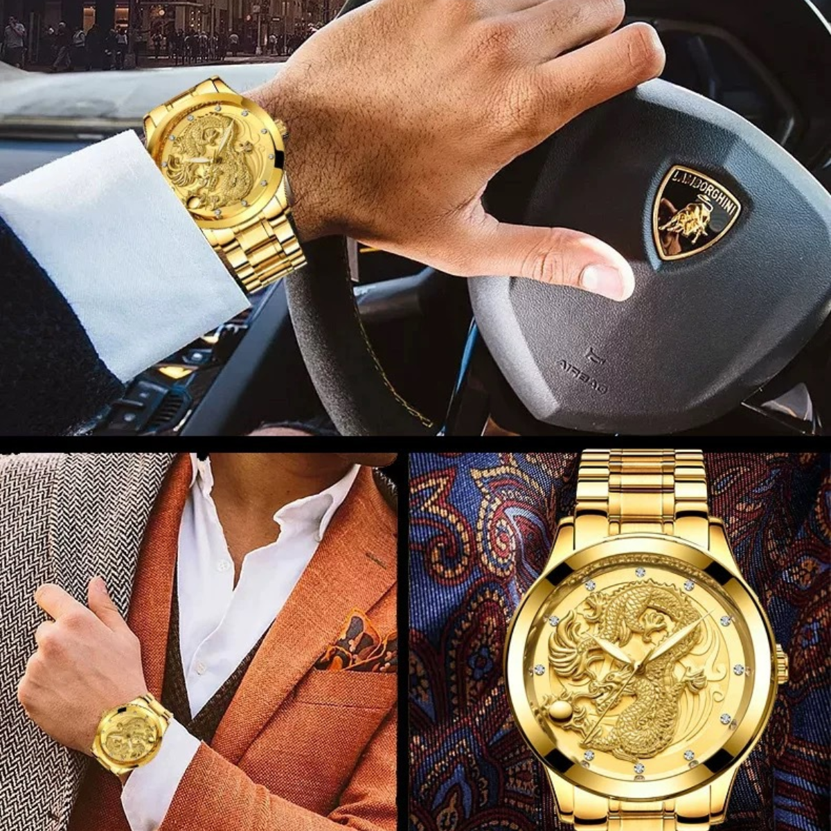Đồng Hồ Nam Mặt Rồng Vàng Nổi 3D Dây Kim Loại Cao Cấp